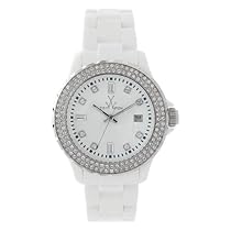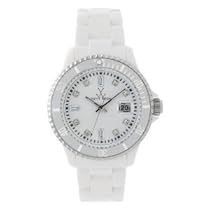 It's ceramic... no it's plastic... IT'S PLASTERAMIC! ® Chic ceramic looking plastic features crystal or tritium dot markers and a rotating bezel.