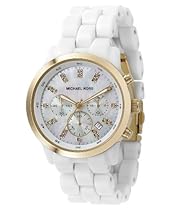White acrylic case with a white acrylic bracelet. Fixed gold-tone bezel. White dial with luminous gold-tone hands and index hour markers. Minute markers around the outer rim. Luminiscent hands and dial markers. Date displays between the 4 and 5 o'clock positions. Chronograph - three sub-dials displaying: 60 seconds 60 minutes and 24 hours. Quartz movement. Scratch resistant mineral crystal. Case diameter: 37 mm. Butterfly clasp. Water resistant at 100 meters / 330 feet. Functions: hours minutes seconds date chronograph. Michael Kors White Acrylic Chronograph MOP Ladies Watch MK5218.
