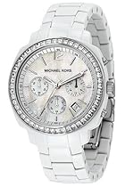 Essential luxuries. White acrylic bracelet and case. Sparkling crystal-accented bezel. White mother-of-pearl chronograph dial with logo date window polished silvertone stick indexes and three subdials. Three hands. Quartz movement. Water resistant to 100 meters. Two-year limited warranty.