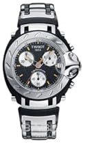 Stainless steel and black resin case with a stainless steel and black resin bracelet. Fixed stainless steel bezel. Black dial with luminous skeletal hands and stick hour markers. Minutes markers. Tachymeter scale around the outer rim. Luminiscent hands and dial markers. Date display at the 3 o'clock position. Chronograph - three sub-dials displaying: 60 seconds 30 minutes and 1/10th of a minute. Swiss quartz movement. Scratch resistant sapphire crystal. Case diameter: 40 mm. Case thickness: 12 mm. Push button deployment clasp. Water resistant at 100 meters / 330 feet. Functions: hours minutes seconds date chronograph tachymeter. Tissot T-Race Mens Watch T0114171205100.