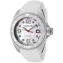 - White mother of pearl dial with luminous hands and dot hour markers; silver-tone arabic numerals at 12:00 and 6:00; screw-down crown; white ceramic on bezel