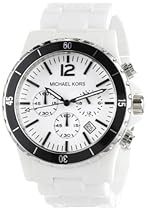 Bold and bright this MICHAEL Michael Kors watch features a white acrylic bracelet and round case. Black bezel. White chronograph dial with black stick indices logo date window and three subdials. Quartz movement. Water resistant to 50 meters. Two-year limited warranty.