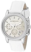 A twinkling timepiece from MICHAEL Michael Kors. White patent croc-embossed leather strap and mixed metal case. Silvertone knurled bezel. White mother-of-pearl dial with logo date window three subdials and square crystal index markers. Chronograph movement. Water resistant to 100 meters. Two-year limited warranty.