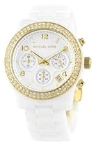 Dazzle them with this bright watch by MICHAEL Michael Kors. White ceramic bracelet and round stainless steel case. Goldtone bezel with crystal accents. White dial with goldtone numerals and stick indices logo date window and three subdials. Quartz movement. Water resistant to 50 meters. Two-year limited warranty.