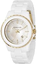 Go for a pure look with this bright watch by MICHAEL Michael Kors. Ion-plated goldtone stainless steel and white acrylic bracelet and round case. White dial with goldtone stick indices crystal accents at indices logo and date window. Quartz movement. Water resistant to 100 meters. Two-year limited warranty.
